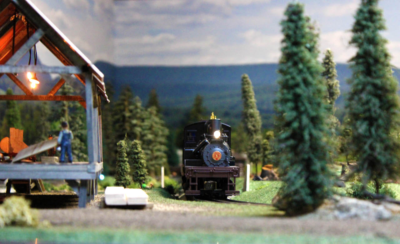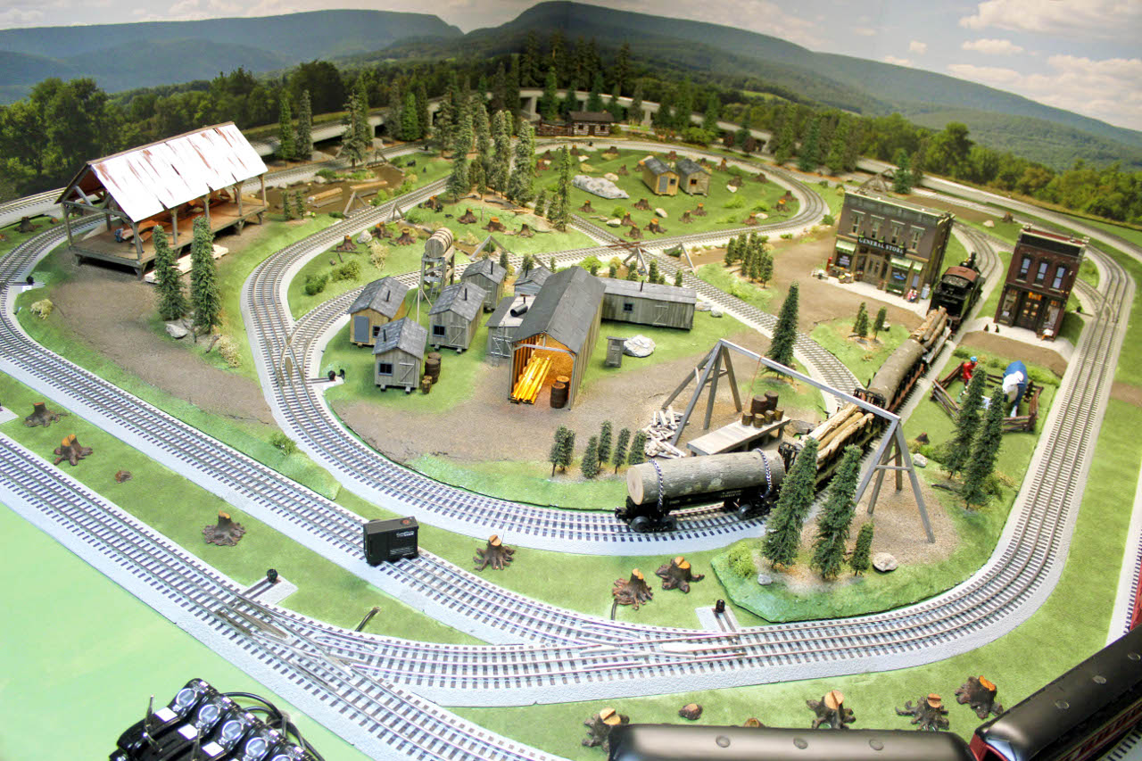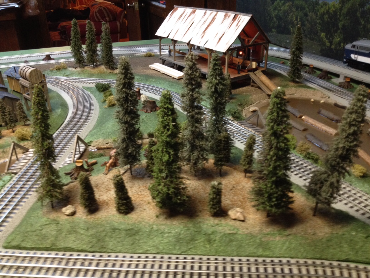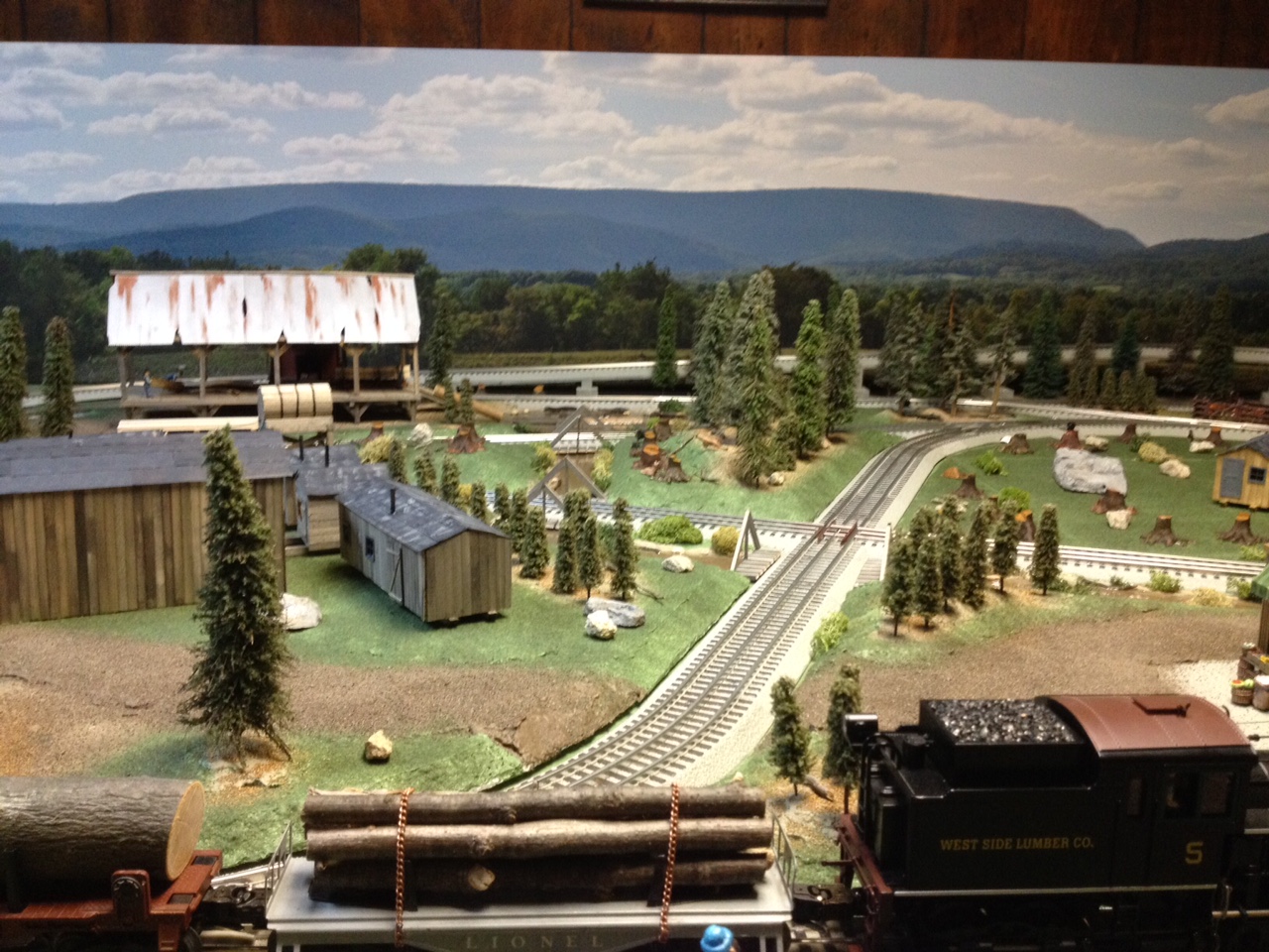 This is a view of the layout looking out over some of the train cars in the logging train and