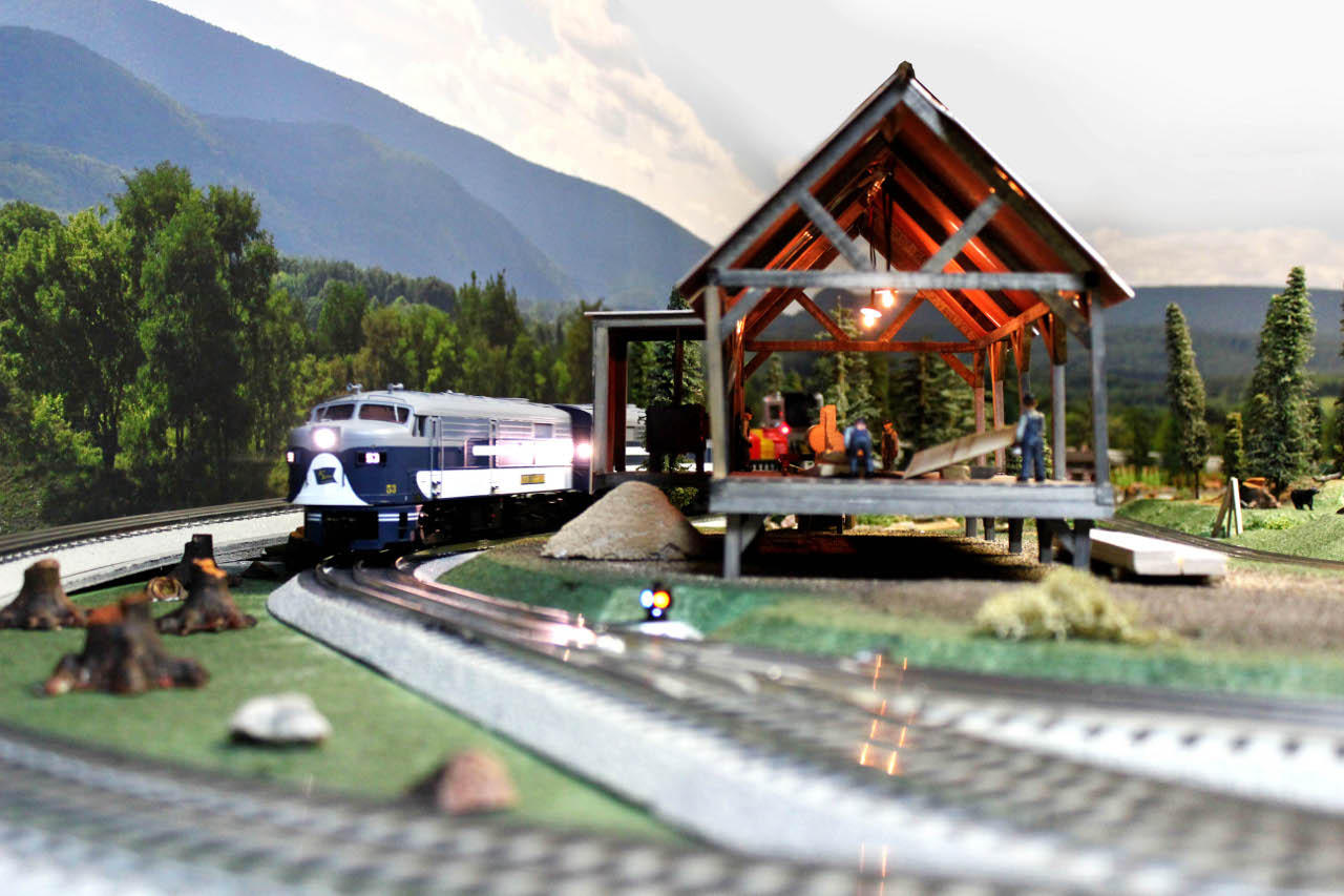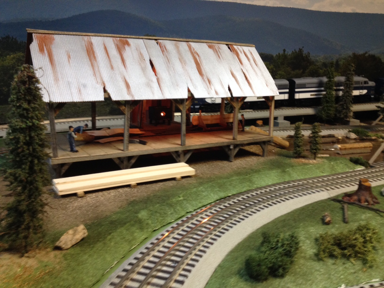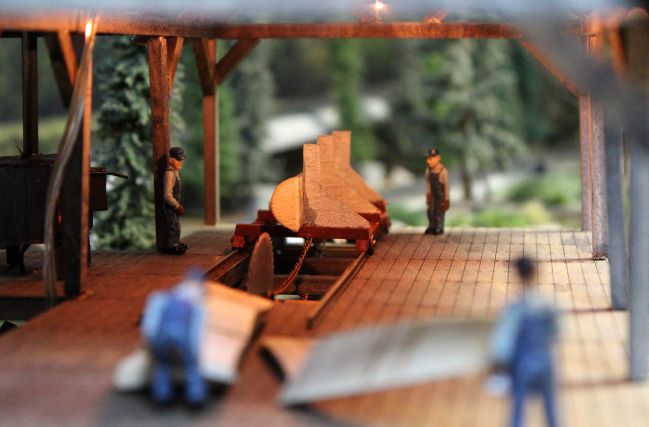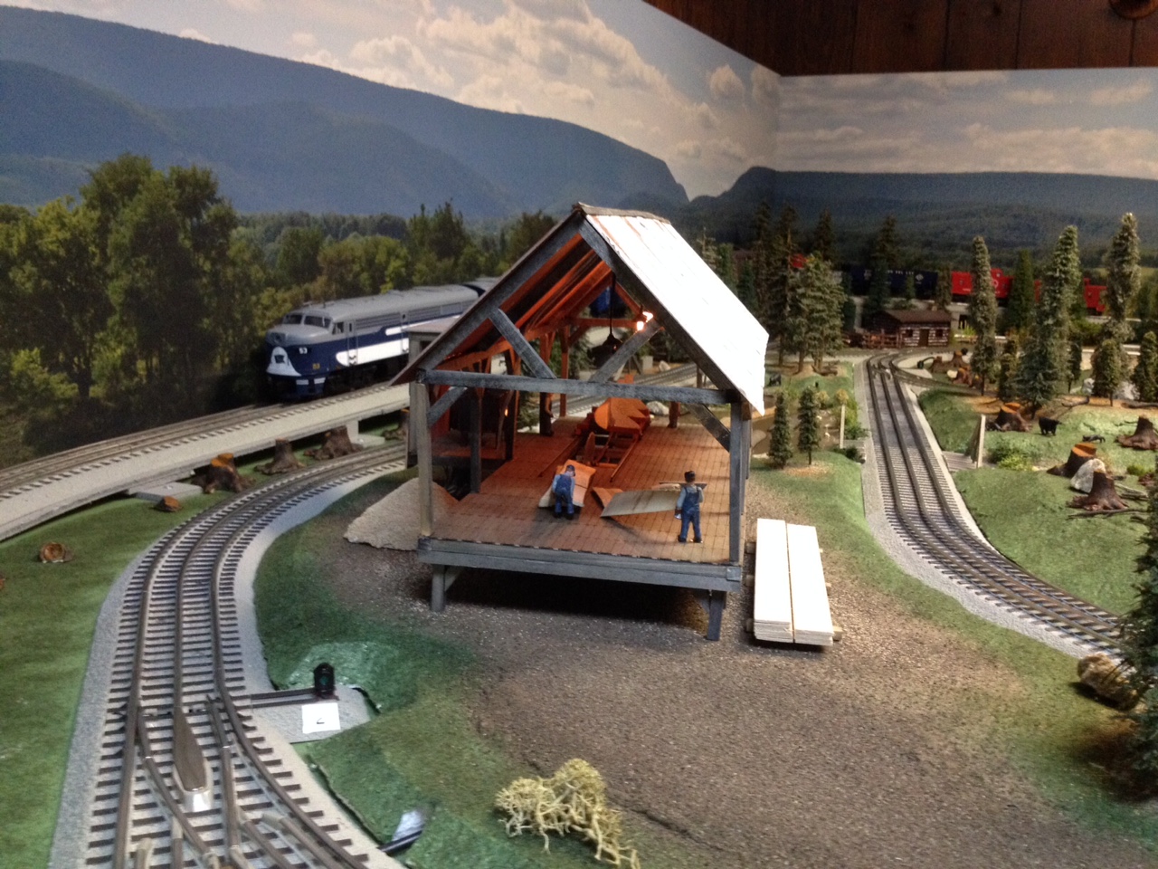 This is a view of the layout looking out over some of the train cars in the logging train and