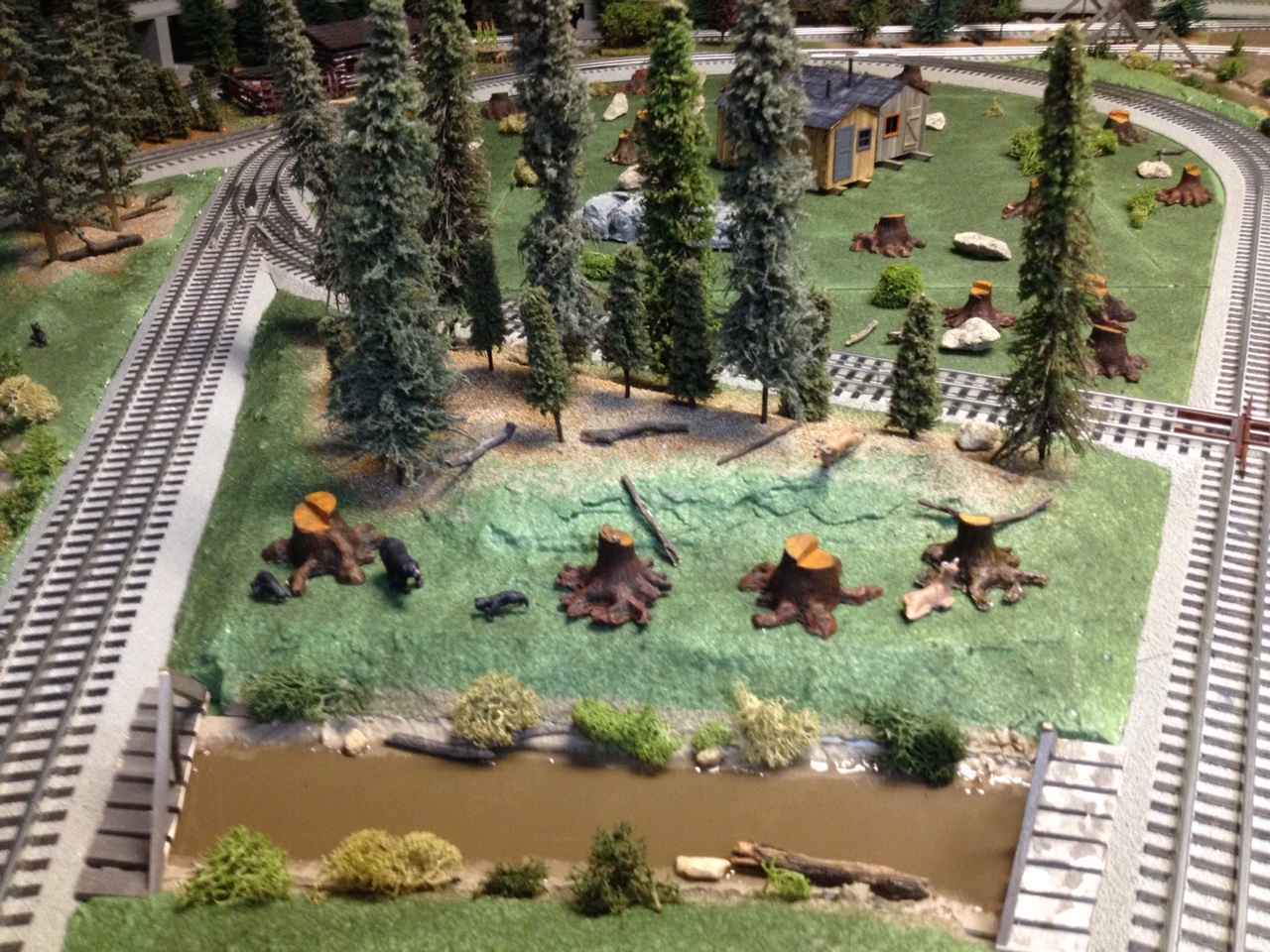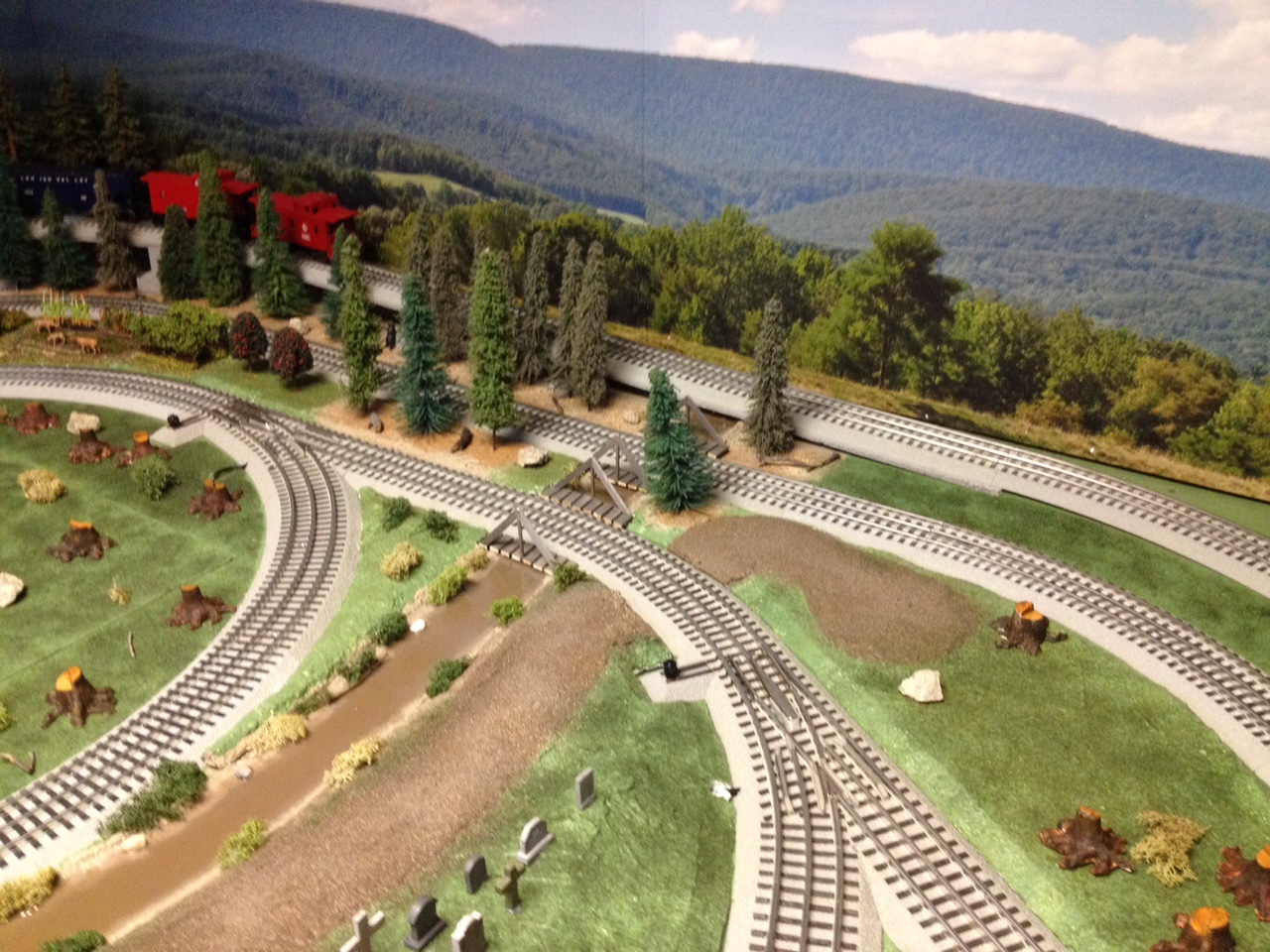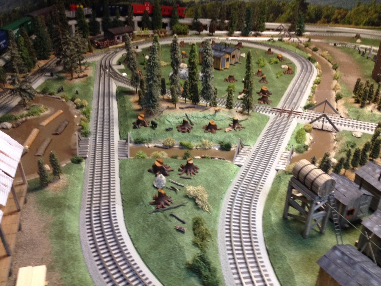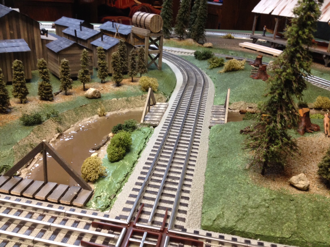 This is a view where rails cross in the figure eight on the layout with the stream alongside the