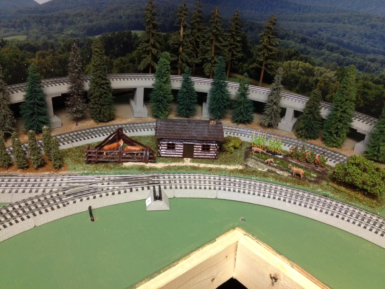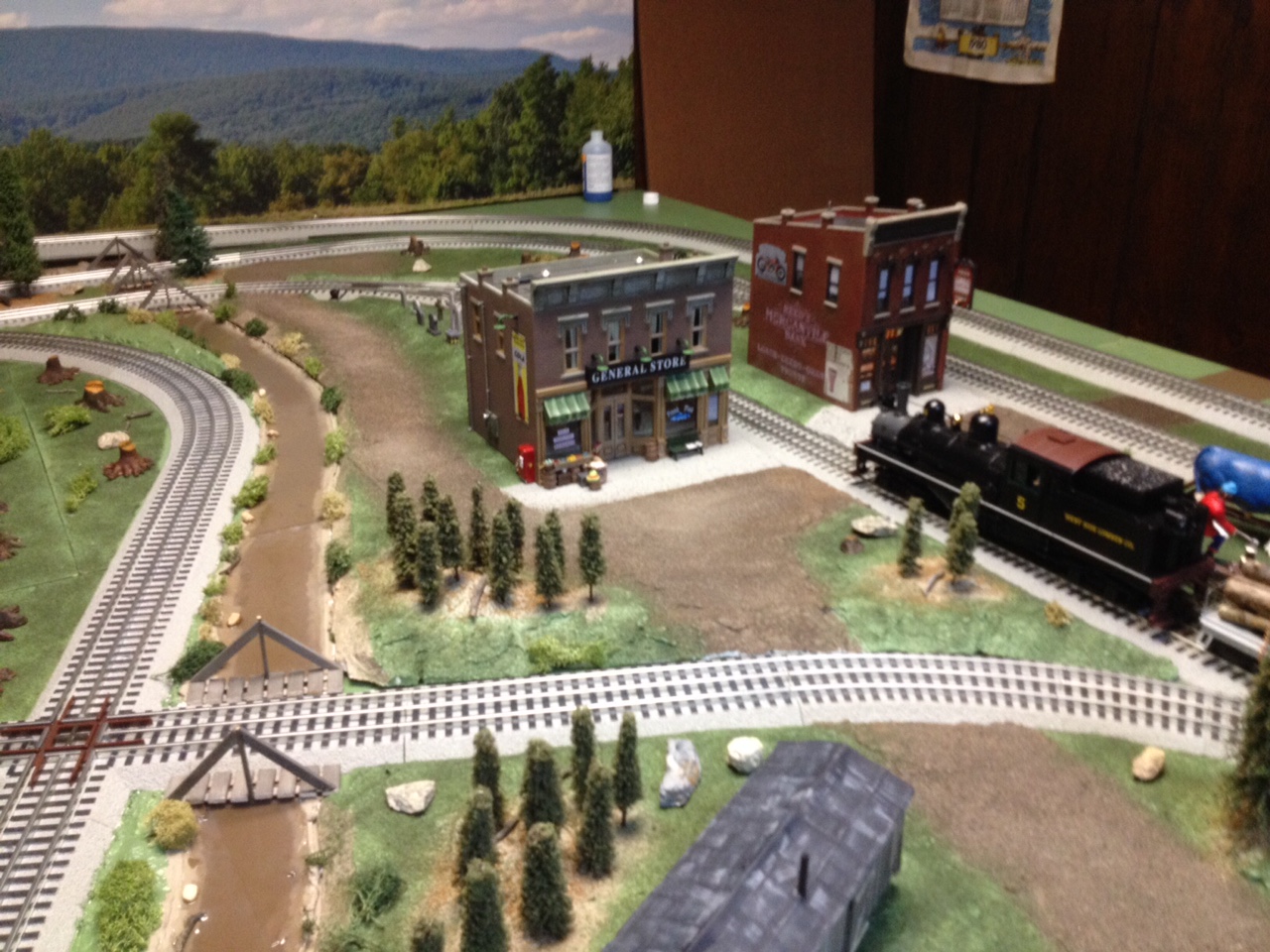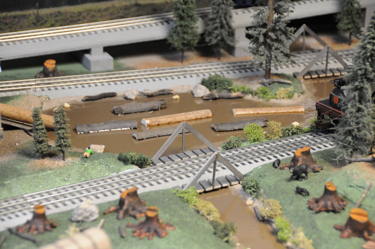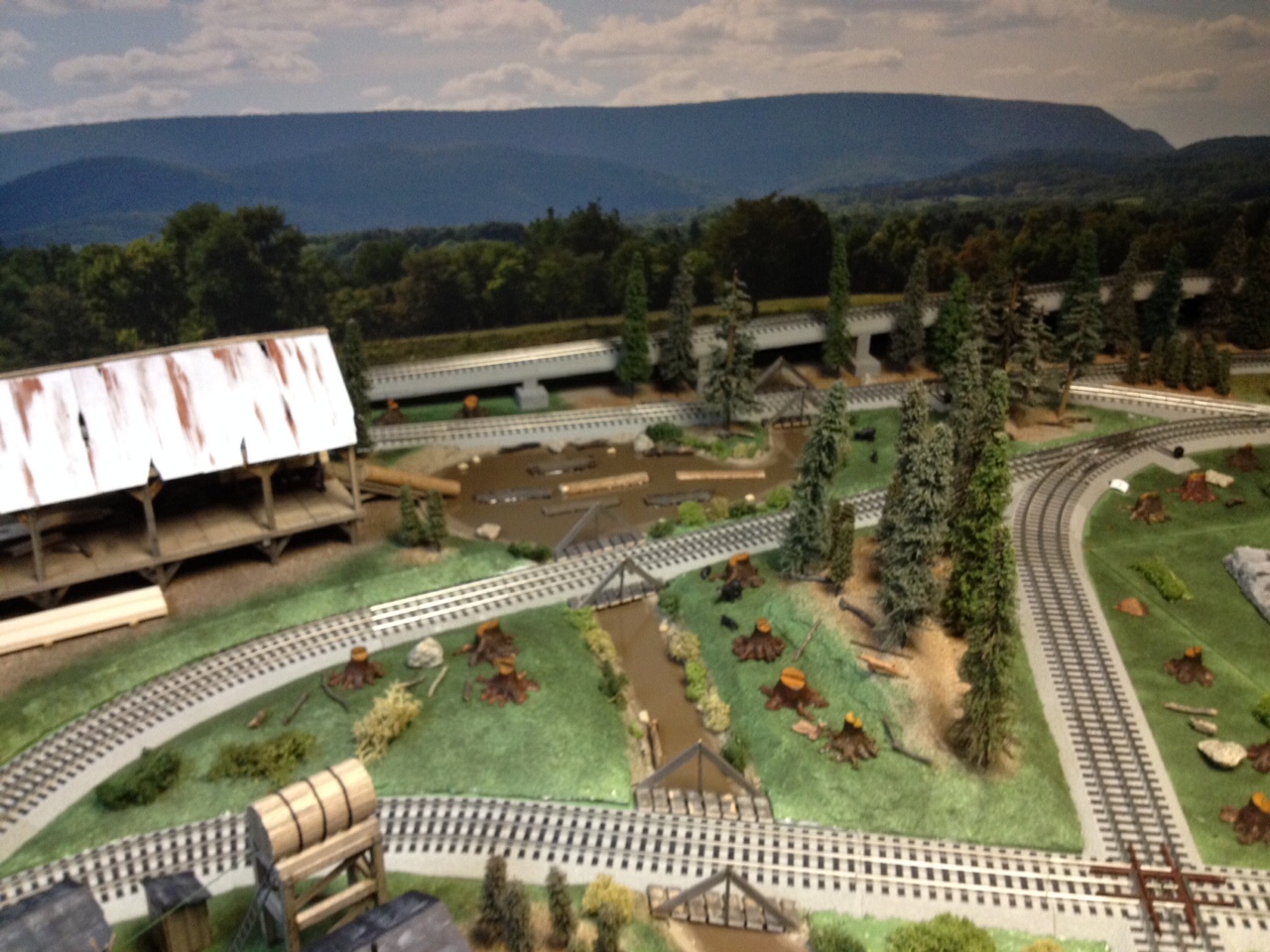 This is a view where rails cross in the figure eight on the layout with the stream alongside the